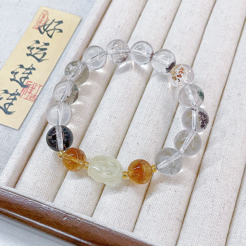 MaisieLin | Citrine Pixiu & Green Phantom Beaded Elastic Bracelet (Bead Size: Approx. 8.5-8.9mm)